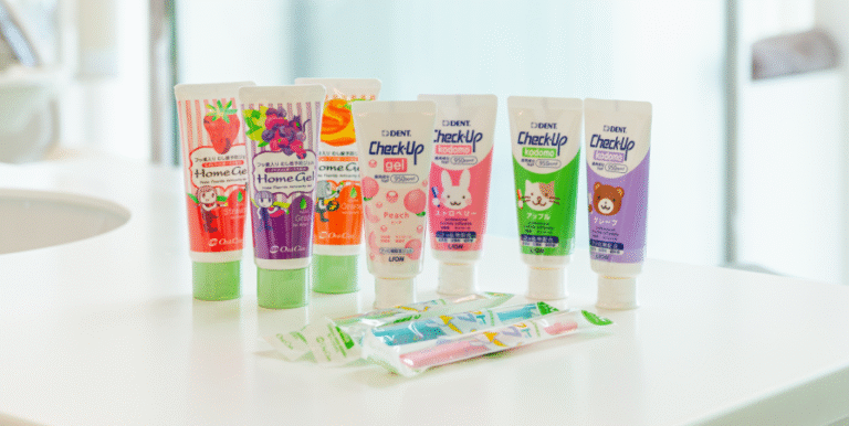 歯磨き前に好きな色の歯ブラシと歯磨き粉を選んでもらって楽しく歯磨き
